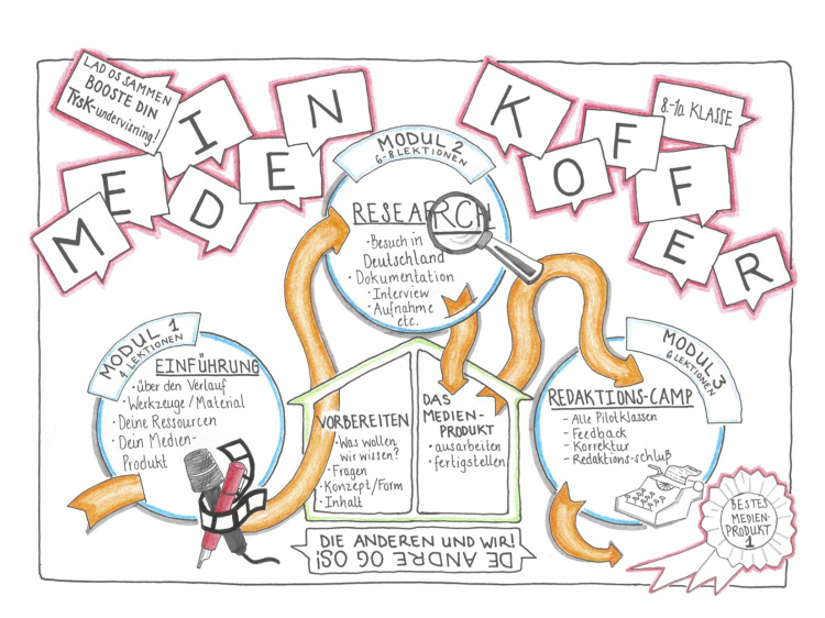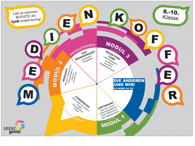 Medien-Koffer er et gratis undervisningstilbud og er en del af undervisningsportalen Grenzgenial, som støttes af Kulturministeriet i forbindelse med Tysklandstrategien. Institutionelt er Grenzgenial forankret i ”Der Nordschleswiger” og ”Bund Deutscher Nordschleswiger”.