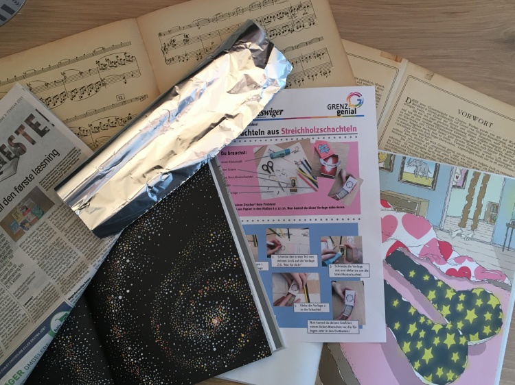 Wenn du keinen Drucker hast, kannst du auch eine Zeitung, Seiten aus einem alten Buch oder alte Noten, Tapetenreste und viele andere Materialien nehmen – nur deine Fantasie setzt Grenzen!