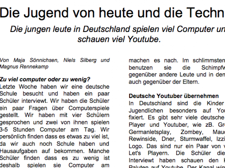 Magnus, Maja und Niels schrieben einen sehr interessanten Artikel zum Thema Computer und E-Sport. Nur knapp verpassten sie die Nominierung für den besten Artikel. Der ging an drei Jungs von der Hærvejsskolen in Rothenkrug.