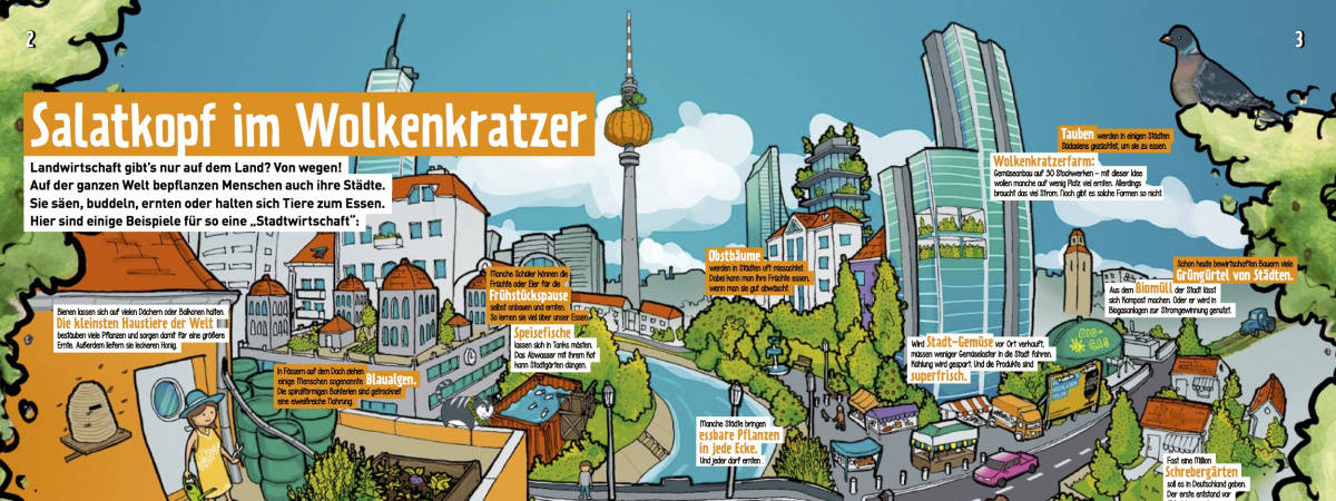 Die Menschen in der Stadt erfinden kreative Lösungen, um Obst und Gemüse in der Stadt zu ernten. Sie halten auch kleine Tiere, um sie zu essen. Das Magazin „Forscher – Das Magazin für Neugierige“ wird von dem Bundesministerium für Bildung und Forschung herausgegeben und hat einige Beispiele für so eine „Stadtwirtschaft“ in einer Infografik für Euch illustriert.